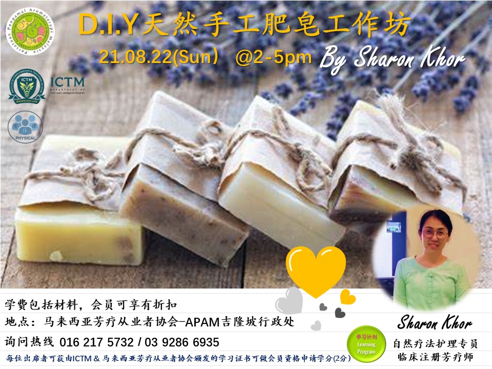 D.I.Y 天然手工肥皂工作坊 21.08.2022, Sunday @ 2-5pm by Sharon Khor 学费包括材料,会员可享用折扣。 地点:马来西亚芳疗从业者协会——APAM吉隆坡行政处 询问热线:016-217 5732 / 03 9286 6935